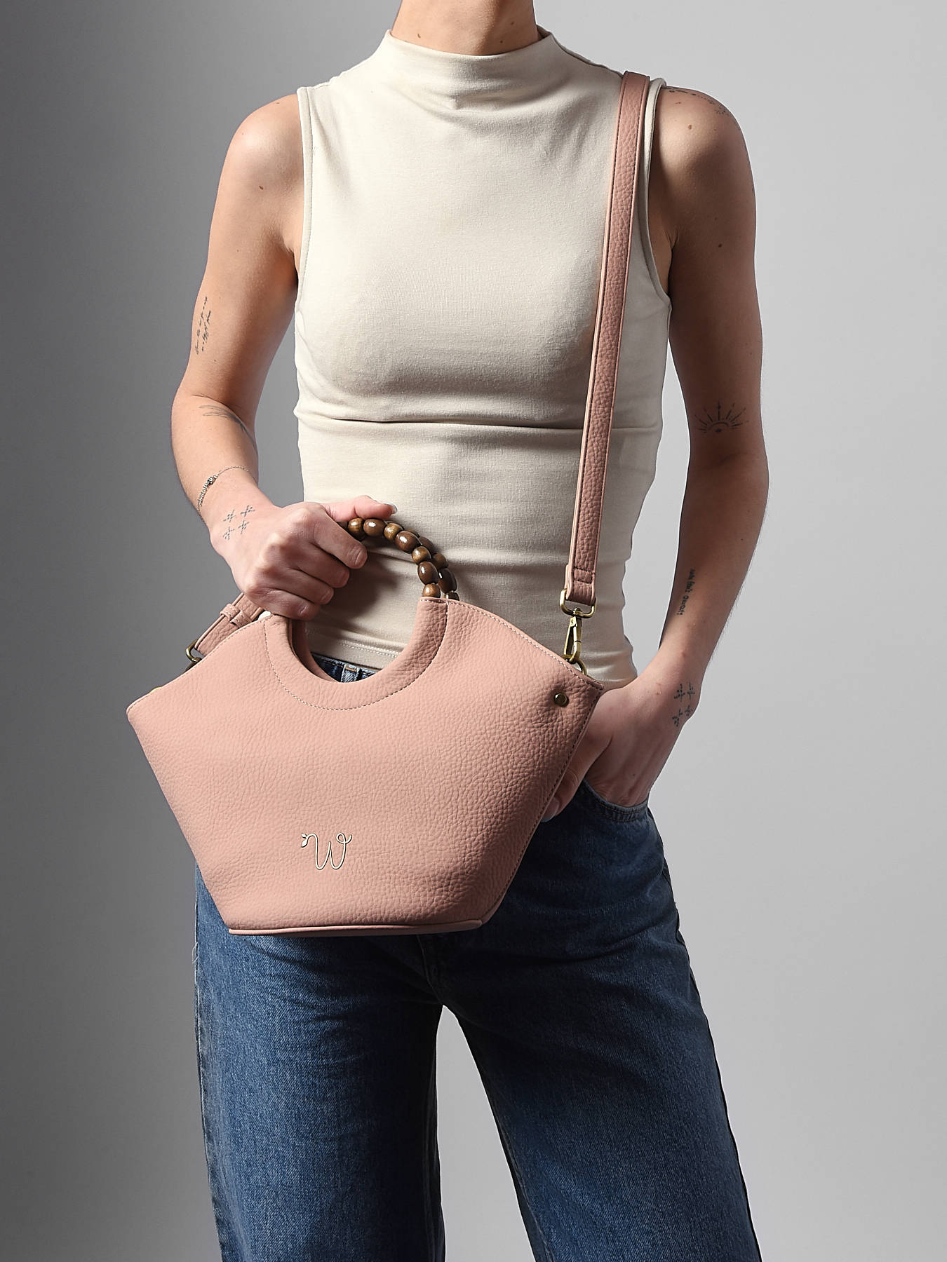 De cross body tas WOOMEN klein formaat uit de lijn Neflier Pearl combineert elegantie, praktisch gebruik en duurzame betrokkenheid. Het hoofdmateriaal van polyurethaan, bestaande uit 58% gerecyclede materialen, in combinatie met een voering van katoen en linnen, biedt lichtheid en stevigheid. Het handvat bedekt met houten parels geeft het model originaliteit en raffinement. Deze tas beschikt over een ritssluiting, een ritsvak aan de achterkant, een afneembare polyurethaan schouderriem voor flexibel dragen, en binnenin een ritsvak en een steekvak om je essentials eenvoudig te organiseren. Het gouden resinelogo maakt het ontwerp compleet en geeft je outfits een verfijnde vleugje.